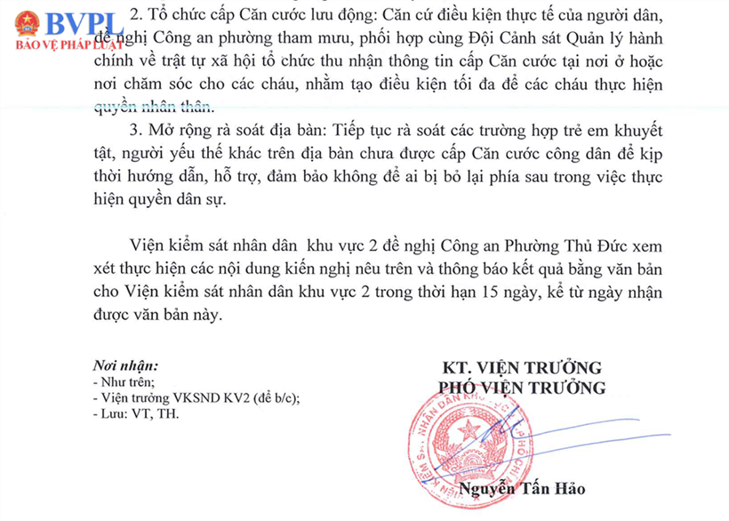 Trên cơ sở đó, VKSND Khu vực 2 đã ban hành văn bản kiến nghị gửi Công an phường Thủ Đức, đề nghị phối hợp rà soát hồ sơ, tổ chức cấp căn cước công dân cho các trường hợp nêu trên bằng hình thức phù hợp với điều kiện thực tế của từng cháu. Nội dung kiến nghị tập trung vào việc bảo đảm quyền con người, quyền trẻ em; không để các cháu bị bỏ lại phía sau trong quá trình thực hiện quyền dân sự, đúng với tinh thần và mục tiêu của Nghị quyết số 205/2025/QH15 của Quốc hội.